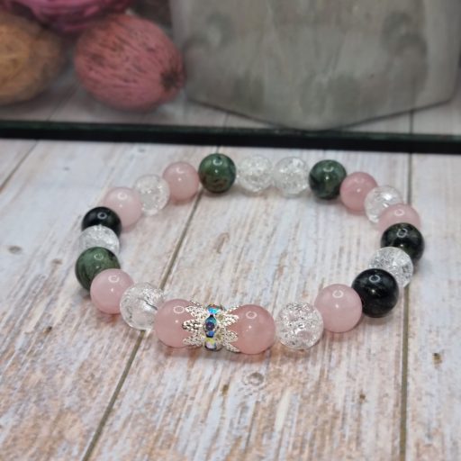 Nagyon szép kambaba-rózsakvarc és repesztett hegyikristályból készült karkötő.