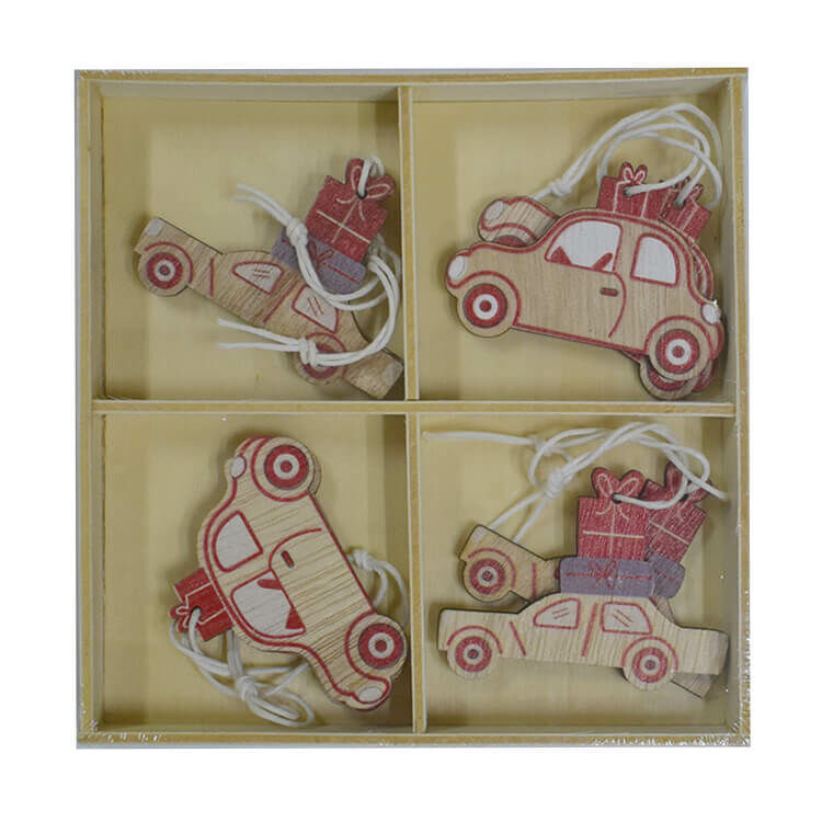 Karácsonyfadísz (8db-os natúr autó, piros ajándék dobozokkal)