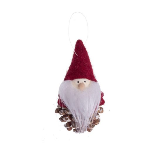Textilből készült tobozmanó, bordó sapkában. Ideális karácsonyfára és belső terek ünnepi díszítésére.