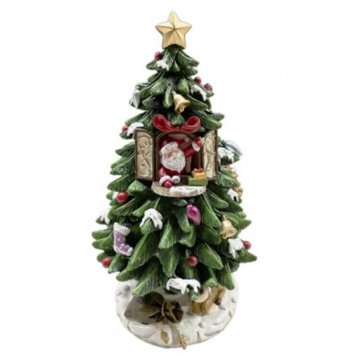 Fehér talpon feldíszített karácsonyfa, mely felhúzható elforgatással. Karácsonyi dallamot játszik le és közben forog.