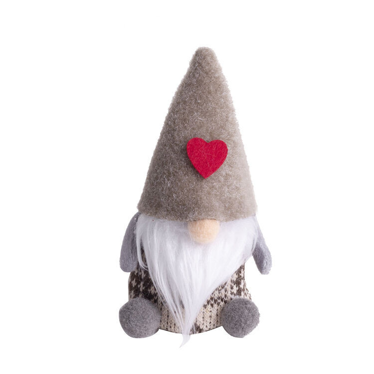 Textilből készült manó kötött pulcsiban, barna sapkában. Ideális belső terek ünnepi díszítésére.