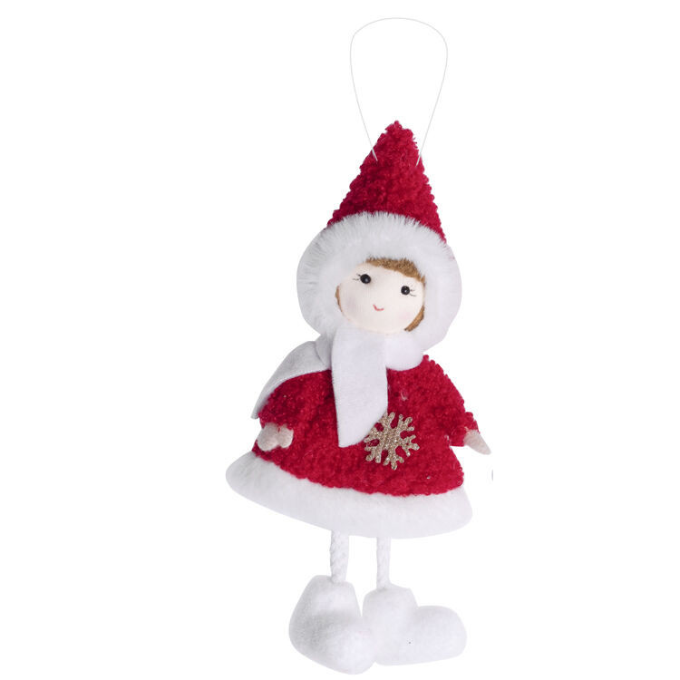 Textilből készült karácsonyi dekoráció- piros bundás lány hópihével. Ideális karácsonyfára és belső terek ünnepi díszítésére.