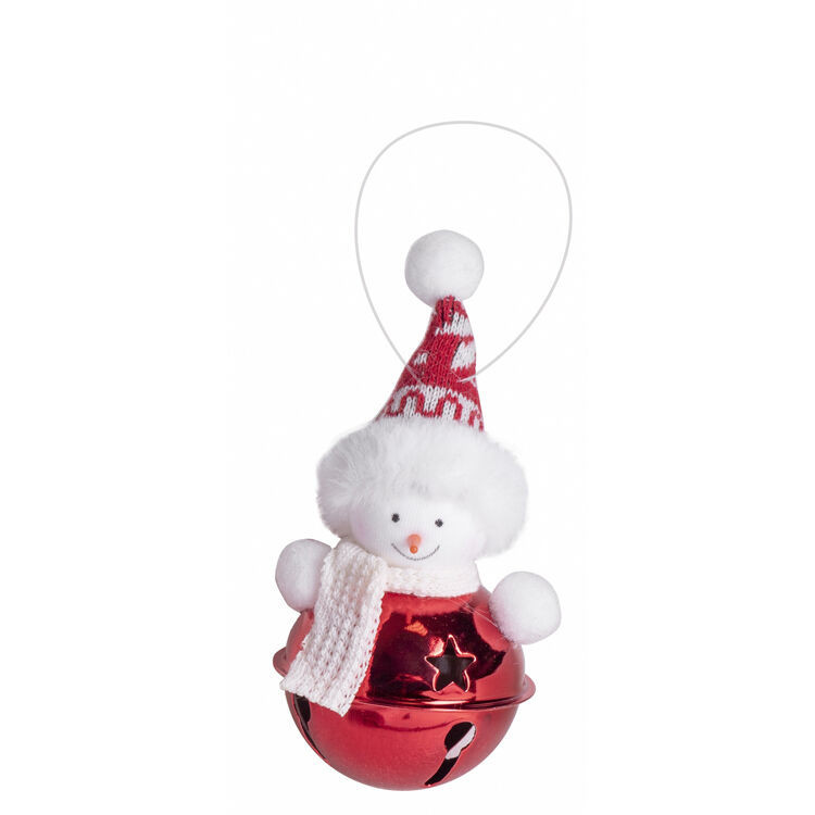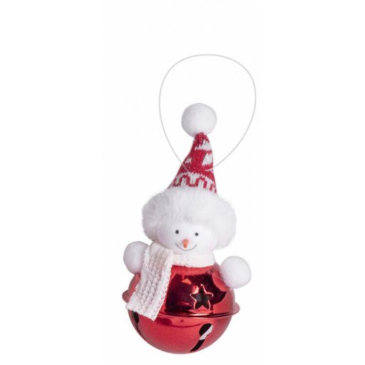 Textilből és fémből készült karácsonyi dekoráció piros sapkás hóemberrel. A piros gömb mozgatásra csörgő hangot ad ki. Ideális karácsonyfára vagy belső terek ünnepi díszítésére.