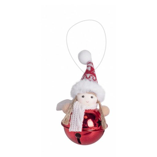 Textilből és fémből készült karácsonyi dekoráció piros sapkás lánnyal. A piros gömb mozgatásra csörgő hangot ad ki. Ideális karácsonyfára vagy belső terek ünnepi díszítésére.
