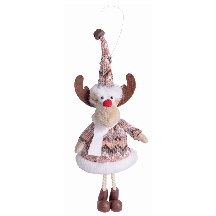 Textilből készült karácsonyi dekoráció- rénszarvas kötött ruhában, fehér sállal. Ideális karácsonyfák és belső terek ünnepi díszítésére.