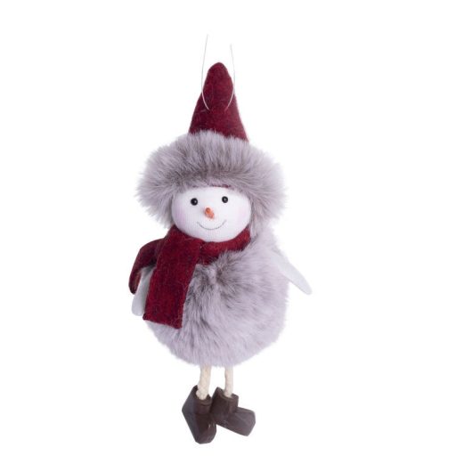 Textilből készült karácsonyi dekoráció-szürke bundás hóember, barna csizmában. Ideális karácsonyfára és belső terek ünnepi díszítésére.