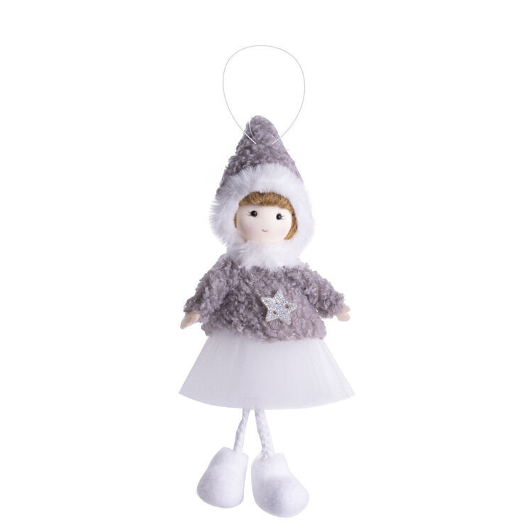 Textilből készült karácsonyi dekoráció- szürke tüllszoknyás lány. A figura lábainak végén csörgők találhatók, melyek hozzájárulnak az ünnepi hangulat megteremtéséhez. Ideális karácsonyfára és belső terek ünnepi díszítésére.