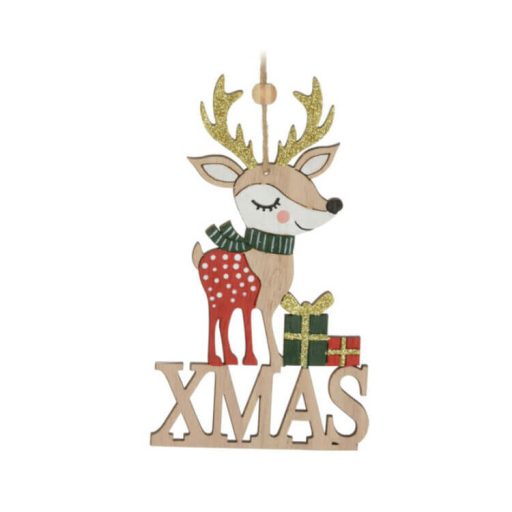 Felakasztható karácsonyi dekorációs figura: jobbra néző rénszarvas XMAS felirattal, melynek teljes hossza kötéllel együtt 20 cm.