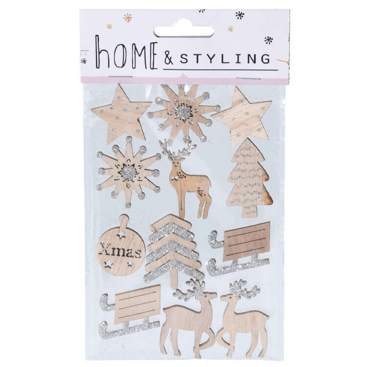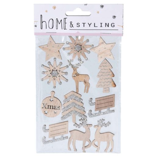 Karácsonyi dekorációs figura (natúr színű öntapadós díszek ezüst csillámporos díszítéssel)