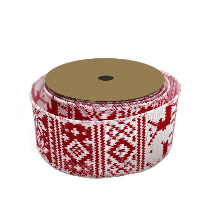 Textilből készült fehér-piros karácsonyi mintás dekorációs szalag. Sokoldalúan felhasználható termék, amelyet ajándékcsomagoláshoz, különböző dekorációs elemek készítéséhez ajánljuk.