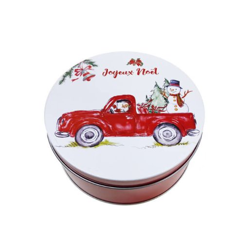 Karácsonyi fém díszdoboz, kör alapú, kicsi (piros Pick-up hóemberrel)