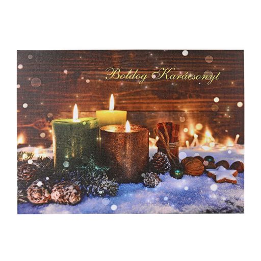 Felakasztható karácsonyi vászonkép fa vázzal és LED hangulatvilágítással. További karácsonyi vászonképek elérhetőek: weboldalunkon A keret oldalán található kapcsolóval a LED világítás még hangulatosabbá teszi a karácsonyi képet. 2 db AA 1,5V-os elemmel működtethető. Az elemeket a csomag nem tartalmazza.