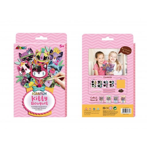 A készletben karcolható és zsenília rudakra rögzíthető kis képeket találhatsz, melyeket egy nagy virágycsokorba kell összekötné és egy szép papírba csomagolni.