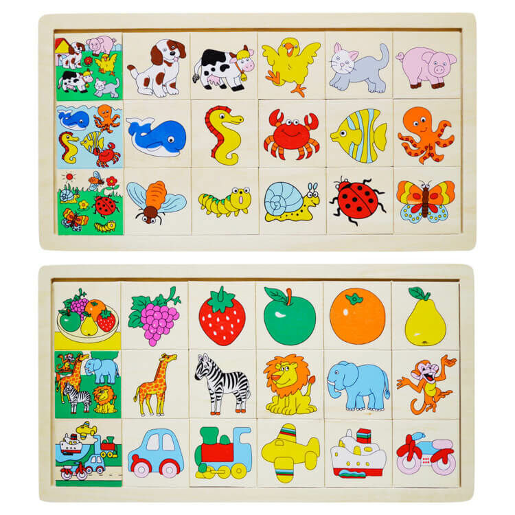 Fából készült színes kirakó szett. A játék lényege, hogy a sor elején található kép részleteit kell megtalálni és kirakni a hozzá tartozó sorba. Kiválóan fejleszti a memóriát, koncentrációt, a felismerő képességet. Mindezek mellett segít a színek, háziállatok, víziállatok, vadállatok, rovarok, gyümölcsök, járművek, neveinek elsajátításában játékos módon.