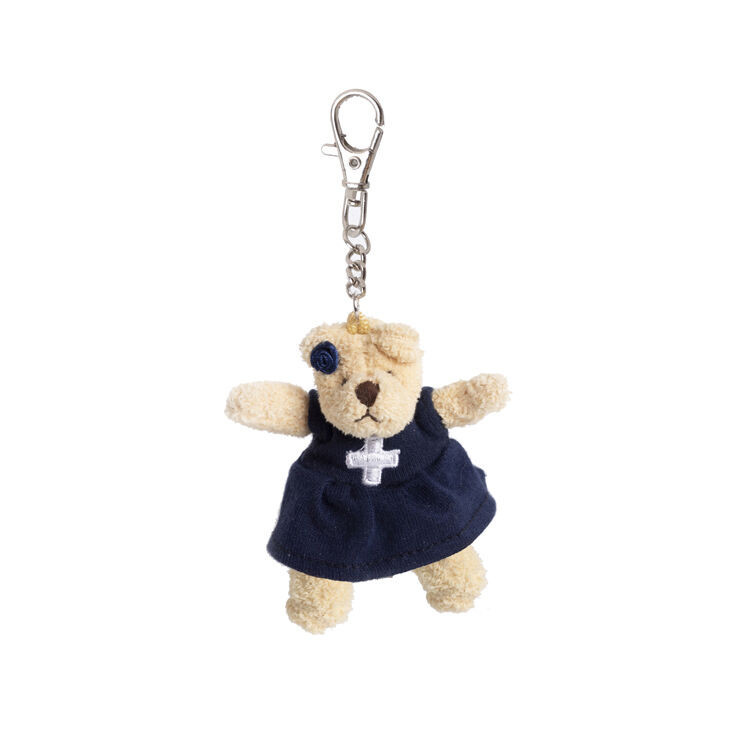 Kulcstartó (maci kék ruhában, fehér kereszttel)