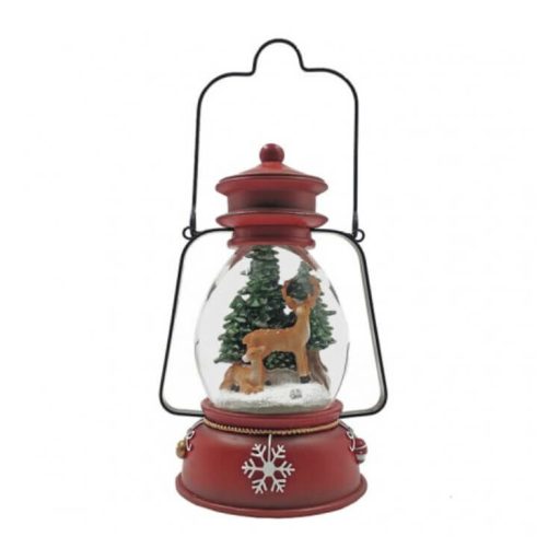 Lámpás, benne szarvasok fenyőfákkal, különböző színű LED világítással és hóeséssel.Az alján beépített kapcsoló van, mely egyik állásban karácsonyi zenét játszik le és LED világítás, illetve hóesés biztosítja az ünnepi hangulatot, míg a másik állásban csak LED világítás és hóesés működik.A lámpás akasztója dekorációs célt szolgál, azon keresztül felakasztani nem alkalmas!A hógömb dekoráció 3db AAA 1,5V-os elemmel működtethető, melyet a csomag nem tartalmaz!