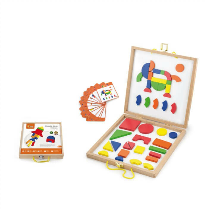 Fából készült színes kirakók. A praktikus, fa bőrönd 42 darab fa elemet és 12 kártyát tartalmaz. A doboz mindkét oldalán mágneses tábla található. A mellékelt kártyák alapján különböző figurákat és formákat tudnak alkotni. Remek játék, mely során fejlődik a gyermekek kreativitása, finommotorikus készsége. Ezeken felül gyakorolhatják a különböző színek és formák elnevezéseit. Intézményi foglalkozásokra is kiváló eszköz.