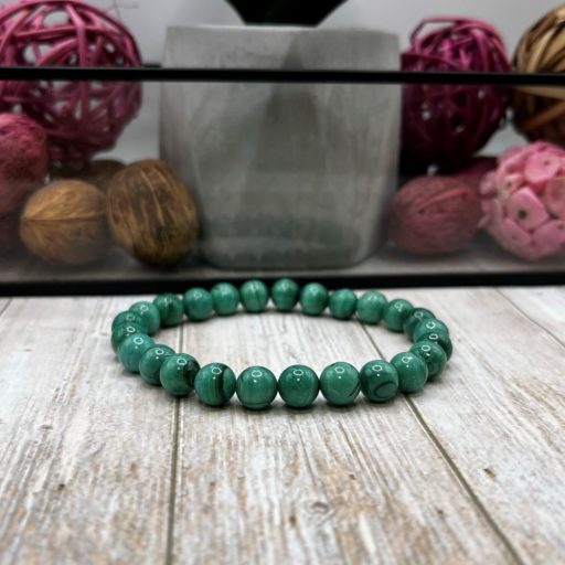 A karkötő 8mm-es gyöngyökből készült rugalmas szilikonra fűzve.