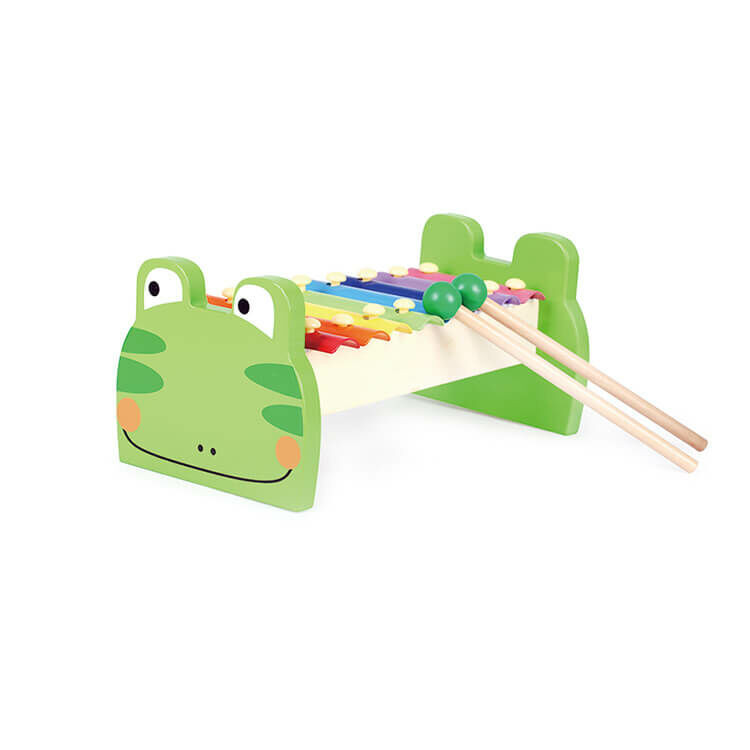Fából és fémből készült békás metalofon. Lehetőséget nyújt a zene megkedvelésére a gyermekek számára, akik még csak most ismerkednek a játékhangszerekkel. Egyszerű a használata, ezért a gyermekek szinte azonnal ráéreznek a zenélés ezen módjára. Kiválóan fejleszti a ritmusérzéket, a hallást és a kreativitást.