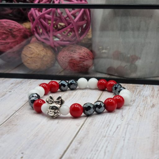Jade és Fazettált Hematit 8mm gyöngyből készült karkötő Minnie egér köztes dísszel.