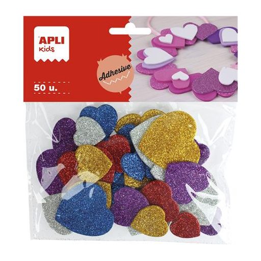 Moosgumi, öntapadó, glitteres, szívek, APLI Kids "Eva Sheets", vegyes színek