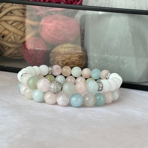 Az egyik karkötő csak morganit ásványt tartalmaz a második karkötő matt morganit, köztes díszek és fehér jade .