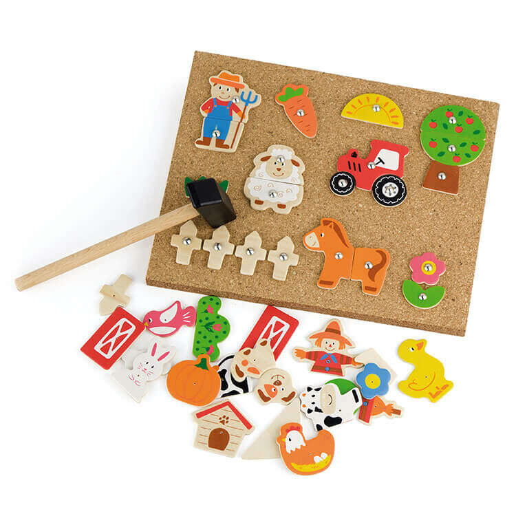 Mozaik szett (farmos). A feladat lényege, hogy a kalapács segítségével a parafatáblára kell illeszteni a különböző szegecsekkel ellátott darabokat. Igazi kihívást jelent a gyermekek számára. Ez a remek kalapácsos játék számos területen fejleszti a gyermekeket, mint szem-kéz koordináció, kitartás, kreativitás, fantázia.