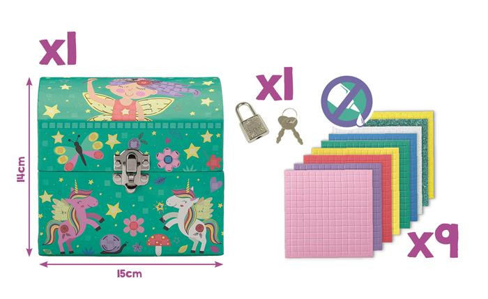 Tündérmesékből ihletett, testreszabható titkos kincsesláda, mely nem hiányozhat egyetlen kislány szobájából sem. A mozaikok helye előre meghatározott, színkódolt, hogy megkönnyítse az alkotást (opcionális). A készlet tartalma: 1 db kincsesláda 9 ív EVA hab mozaik matrica (7x7 cm) 1 db kis fém lakat 2 kulccsal Kincsesláda mérete: 150x120x140 mm Ajánlott kor (év): 5+ Gyártó/első EU forgalmazó elérhetősége: MAPED SAS 530 route de Pringy - 74370 Argonay sophie.souillard@maped.fr www.maped.com