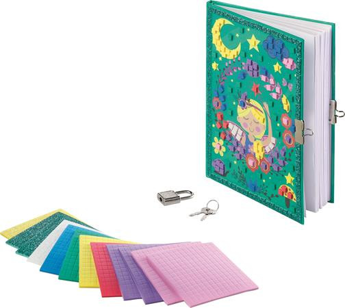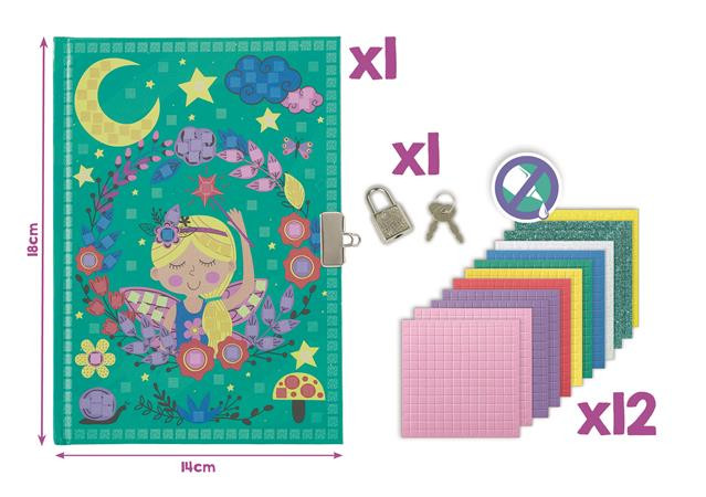 Tündérmesékből ihletett, testreszabható titkos napló, melyre minden kislánynak szüksége lehet. A mozaikok helye előre meghatározott, színkódolt, hogy megkönnyítse az alkotást (opcionális). A készlet tartalma: 1 db napló 60 vonalas lappal (70g/lap) 12 ív EVA hab mozaik matrica (7x7 cm) 1 db kis fém lakat 2 kulccsal Napló mérete: 132x184 mm Ajánlott kor (év): 5+ Gyártó/első EU forgalmazó elérhetősége: MAPED SAS 530 route de Pringy - 74370 Argonay sophie.souillard@maped.fr www.maped.com
