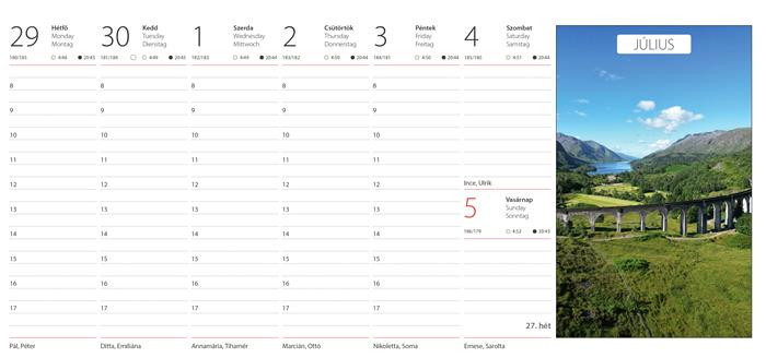 Minden irodában nélkülözhetetlen. Senki sem vitathatja, hogy az asztali naptárak az irodavilág egy leghasznosabb segítői. Ha Önnek fontos a pontosság, az időpontok betartása és ezáltal az ügyfelek elégedettsége, akkor a cég egyik asztaláról sem hiányozhatnak ezek a tervező alkalmatosságok. -időbeosztás: félórás, 8-17.00 h -magyar-angol-német nyelvű naptárháló -névnapok, magyar ünnepek és hasznos információk minden napra -extra sorok a munkaidőn túli események feljegyzésére -elegáns fém ikerspirál a szebb megjelenésért -magyar-angol nyelvű képleírások -válogatott színes képek minden hétre -méret: 320x150 mm -reklámfelület: 320x40 mm -27 lap -54 kép -lap típusa 115 g/m2, fehér ofszet