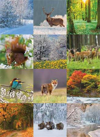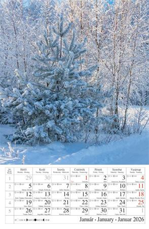 -naptár rész: magyar, angol, német nyelven, magyar  ünnepek  és névnapokkal, napkelte, napnyugta és holdállás  feltüntetésével