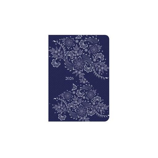 Színes grafikával díszített, matt fóliával bevont, fehér tömbös heti naptár, jelzőszalaggal.