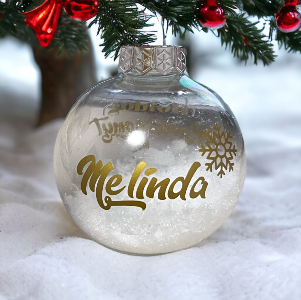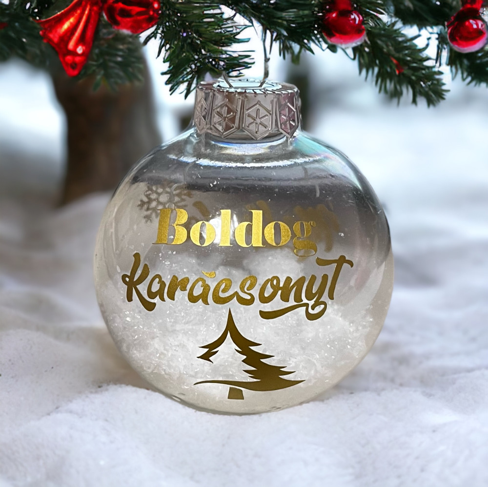 Átlátszó, 8cm átmérő műanyag gömb, műhóval megtöltve.