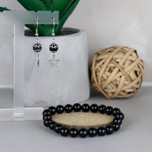 Ónix 8mm-es ásványból készült fülbevaló, ezüst színű csillaggal és gyöngykupakkal.