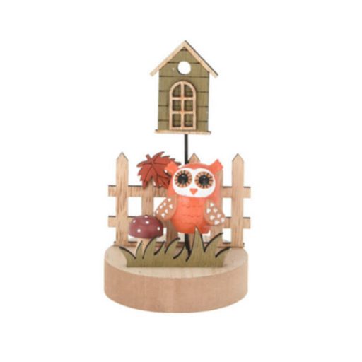 Őszi dekorációs figura (narancssárga bagoly bordó gombával fa hengeren kerítéssel és házikóval)