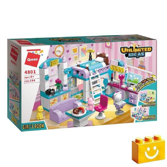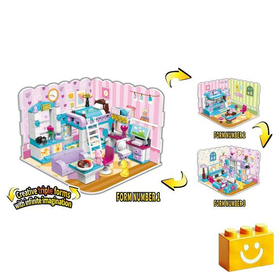 QMAN® 4801, készségfejlesztő építőjáték lányoknak, 3 az 1-ben Lányszoba : nappali, hálószoba, konyha