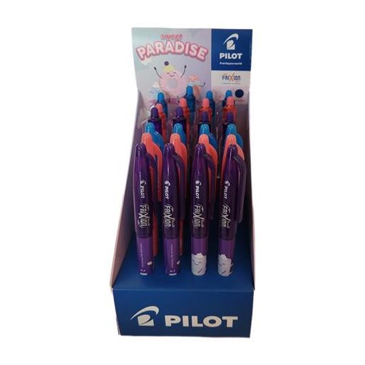 -a display tartalma 4-4 db "Frixion Ball Fancy" kupakos rollertoll korall rózsaszín, világoskék és ibolya testszínben, és 4-4 db "Frixion Clicker Fancy" nyomógombos rollertoll korall rózsaszín, világoskék és ibolya testszínben