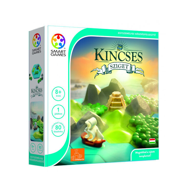 Fedezze fel modern és izgalmas játékainkat, vásárolja meg termékünket kényelmesen webáruházunkból! A játék menete: A Kincses sziget célja a titkos templom helyének felderítése a feladványban megadott tippek segítségével. A játék 4 puzzle-darabot tartalmaz, egyedi váltószerkezettel és 1 rögzített darabot (a templommal). 1. Válassz egy feladványt. Minden feladvány egy térképet mutat a szigetről hatszögekre felosztva. Egy hatszög a négy terep egyike lehet: víz (kék), dombok (világos zöld), hegyek (szürke) vagy erdők (sötétzöld). A kincsestérkép gyakran hiányos (fehér hatszögek). A nehezebb feladványok kevesebb utalást mutatnak a terepviszonyokra vonatkozóan. 2. Helyezd el a puzzle-darabokat a játéktáblán úgy, hogy a különböző színű területek a feladatban látható helyekre kerüljenek: •Ha egy hatszög fehér, neked kell kiválasztani, hogy milyen színű terület kerüljön oda. •A templom helyzete soha nem jelenik meg a feladványban. Egy üres világoszöld hatszöget fogsz látni helyette, mert ilyen színű a terület, ahol a templom van! •A hajó helyzete szintén nem jelenik meg a feladványban, csak a kék hatszög. •A mozgó puzzle-darabok 4 különböző formába alakíthatóak, az egyes puzzle-darabok két részét mozgatva, egymáshoz forgatva. A templomos darab nem módosítható. •A mozgatható puzzle-darabok két oldalon nyílással rendelkeznek. Csak akkor változtathatod meg a puzzle-darab alakját, ha ezek a nyílások egymással szemben vannak. TIPP: Mielőtt elkezdenél játszani, próbáld ki a 4 különböző lehetőséget minden egyes puzzle-darabon. Minden mozgatható puzzle-darabnak különböző lehetőségei vannak. Mikor minden puzzle-darabot elhelyeztél a játéktáblán és a terepviszonyok megegyeznek a feladatban látható térképpel, megtaláltad a megoldást... és a kincses templom rejtekhelyét is! Minden feladványnak egy megoldása van, amit megtalálsz a füzet végén.