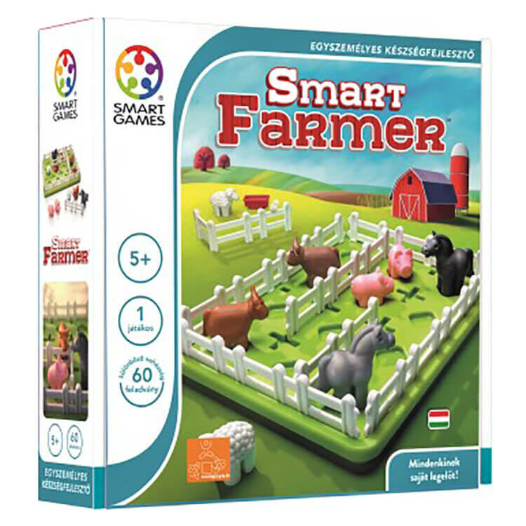 Smart Games: Smart Farmer: lesz mindenkinek saját legelője? Az állatok nagy rendetlenséget csináltak a farmon, így eljött a rendrakás ideje! Különítsünk el egymástól az állatokat, illetve alakítsuk ki legelőjüket, de nem egyszerű ám a feladat: mindösszesen csak 3 kerítést kaptunk a farmertől, így jól át kell gondolnunk, hogyan alakítsuk a lovak, tehenek és disznók saját legelőit, figyelve arra is, hogy mindenkinek legyen itatója! 60 különböző nehézségű feladvány vár ránk! A logikai játékot 5 éves kortól ajánljuk.