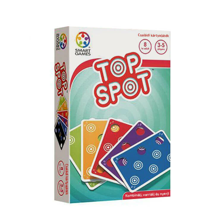 Smart Games, Top Spot logikai játék - a kártyákat kombinálva nyerhetsz! A Top Spot egy kártyajáték, olyan lapokkal, amelyeken foltok és lyukak vannak. A kártyák kombinálásával a játékosok köröket nyernek, ezzel pontokat gyűjtenek. A cél, hogy a kör végére elérjük a legmagasabb pontszámot. A kártyák mérete: 5,7 x 8,7 cm. A logikai játék Magyar nyelvű leírást tartalmaz!