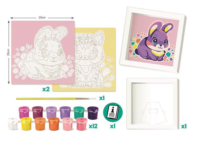 A számfestés remek szórakozás a gyerekeknek, akár a szobájuk dekorálására! A számok szerinti festéssel a gyerekek a számokat követve könnyedén festhetnek. Fejleszti a koncentrálást, segíti őket az instrukciók követésében, és játékos és pihentető módon kifejezni művészi tehetségüket! A készlet tartalma: - 2 db számozott vászon (cica, nyuszi) - 1 db ecset - 12 különböző színű festék - 1 db papír keret Ajánlott korosztály: 7+ Gyártó/első EU forgalmazó elérhetősége: MAPED SAS 530 route de Pringy - 74370 Argonay sophie.souillard@maped.fr www.maped.com