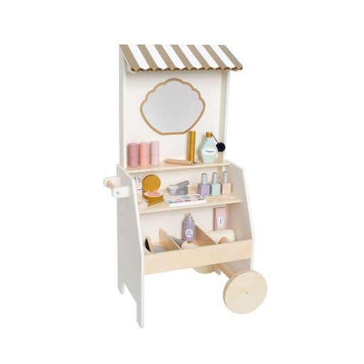 Minden tartozék fából készült a maszatmentes játék érdekében. A szépségszalon kerekekkel és fogantyúkkal rendelkezik, így könnyen mozgatható, a két polcon pedig minden smink- és hajápoló termék tárolható. Összesen 26 különböző luxus tartozékot tartalmaz.