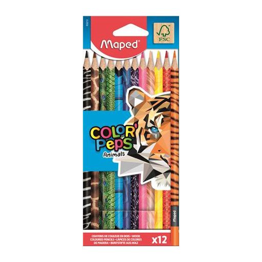 Színes ceruza készlet, háromszögletű, MAPED "Color'Peps Animal", 12 különböző szín