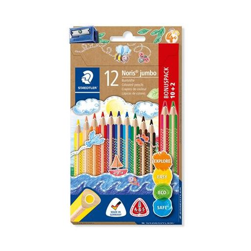 Színes ceruza készlet, háromszögletű, vastag, hegyezővel, STAEDTLER "Noris® Jumbo 128", 10+2 különböző szín