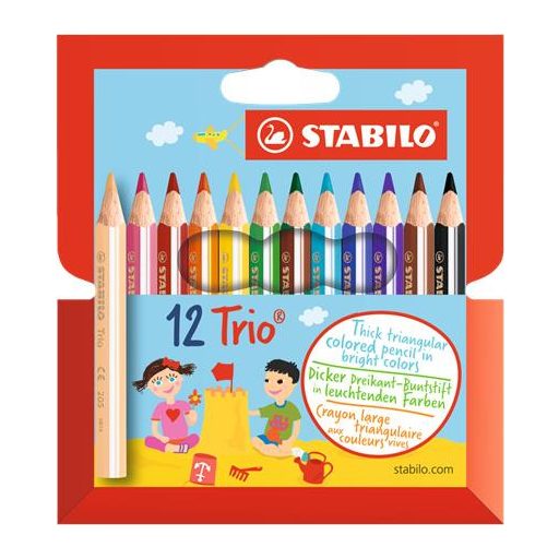 Színes ceruza készlet, háromszögletű, vastag, rövid, STABILO "Trio", 12 különböző szín