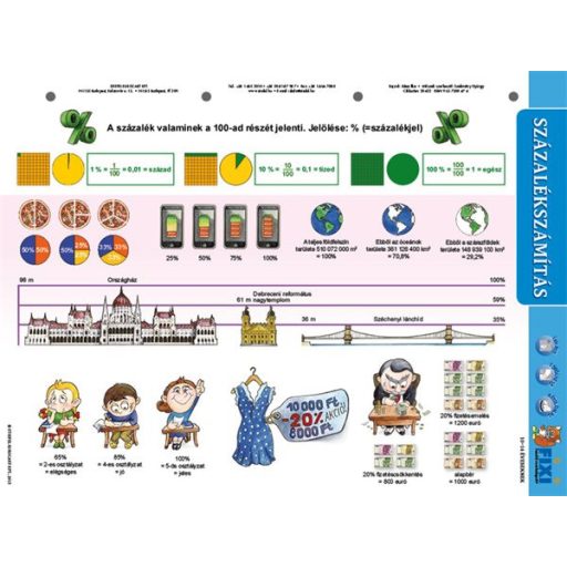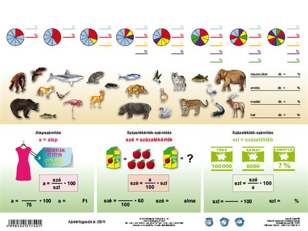 A Százalékszámítás című tanulói munkalap a felső tagozatosok matematikai képzésének kitűnő kiegészítője. A négy alapművelet után a leggyakoribb, legfontosabb matematikai művelet, amelyet majd a nebulók felnőtt életük során használnak éppen a százalékszámítás A pedagógusok a százalék és a százalékszámítás fogalmának megértését a jól érthető, egyszerű példák minél nagyobb számban történő felvonultatásával szokták áthidalni, mint a varrónői mérőszalagok vagdosása, fapálcikák, dominók rakosgatása, száz centis vonalzó bemutatása… Ezt a munkát könnyíti meg nagymértékben Százalékszámítás munkalap, amely nemcsak a lehető legegyszerűbb, jópofa illusztrációk segítségével érteti meg a tanulókkal a százalék fogalmát, de néhány játékos feladattal is bír. A haladók számára pedig a termék három, a százalékszámítás alapképleteit is bemutató, oda vissza megoldható példát is bemutat.
