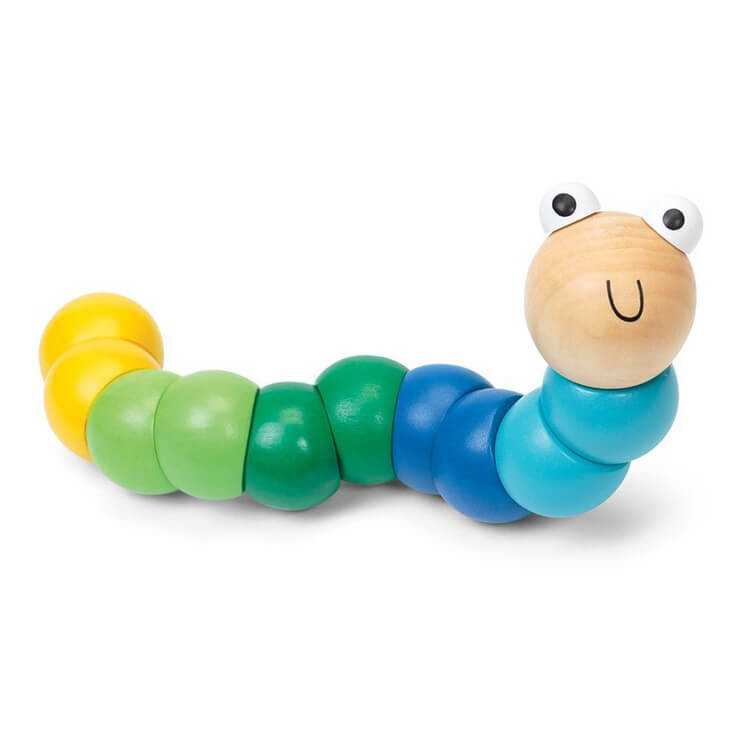 Fából készült színes babajáték. Könnyedén tekerhető és csavarható a tizenegy elemből álló kukac. Fejleszti a szem-kéz koordinációt és a finommotorikus készséget.