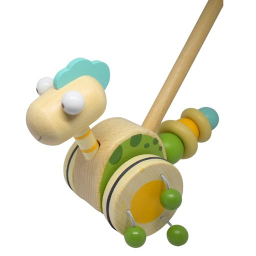 A zöld színű tologatós dínó formájú játék nemcsak funkcionális, hanem vizuálisan is vonzó. Az élénk színek és a barátságos dínó forma azonnal felkeltik a gyerekek érdeklődését és garantálják, hogy a játék hamar kedvenccé válik. A színes kialakítás segít stimulálni a gyerekek vizuális érzékelését és hozzájárul az esztétikai ízlésük fejlődéséhez.
