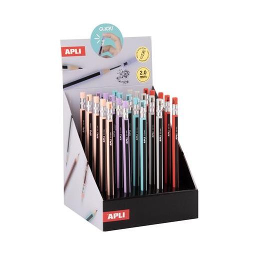 Töltőceruza display, mechanikus, 2 mm, hegyezővel, ceruzahatású, APLI, vegyes színekben, 25 db