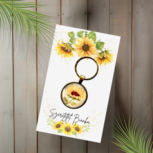 Egyedi üveglencsés kulcstartó, napraforgó mintával.